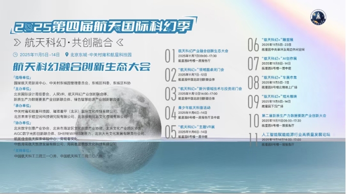 当航天硬核科技邂逅科幻文化创意,当产业资源碰撞跨界机遇——2025年11月7日,第四届航天国际科幻季・航天科幻融合创新生态大会将在中关村雍和航星科技园举办!汇聚航天英雄、行业大咖、企业领袖,打造 “航天+” 产业生态盛宴,现报名通道全面开启,诚邀您共赴这场引领行业未来的巅峰之约!