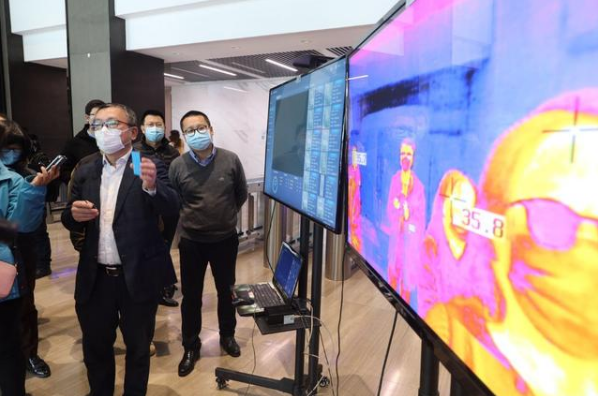 走进前沿中心一楼大堂,就能听到热情的问候:“您现在的体温是36.1度,没有发热症状。”声音来自一台机器人,在它的显示屏上有3个区域:红外热成像、实时图像采集、全国疫情数据。行人的脸部范围在热成像区域被框出,同时显示对应的温度值。随后有同时进来的多名员工,机器人逐一播报出了他们的体温值。