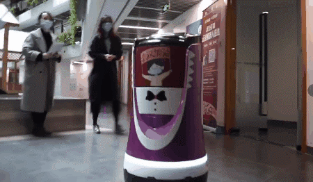 云迹科技利用物联网技术,将送餐机器人与食堂订单器、电梯、楼门、货柜等链接起来,使机器人在大楼内畅通无阻,及时、准确地为员工们服务。疫情期间,由机器人送餐,减少了食堂人员的送餐压力,也在疫情防控方面发挥了很大作用。除了这款送餐机器人之外,还有另外一款货架式送餐机器人,单次可送10份外卖,从地下一层出发,一趟来回仅需5-10分钟。