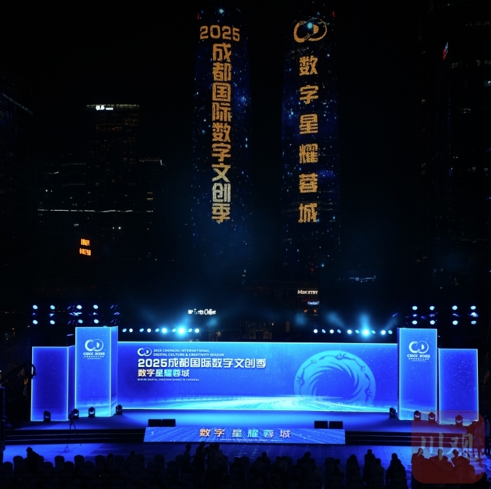 9月28日晚,成都交子大道。在天府双塔璀璨灯光秀中,2025成都国际数字文创季启幕。