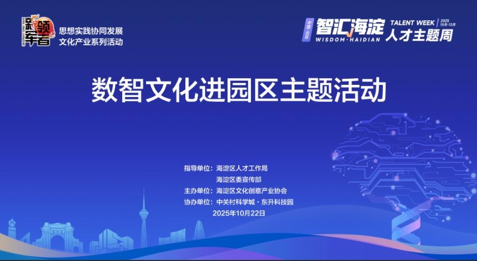 2025年10月22日,“文科造浪・不等风来”数智文化进园区主题活动暨AIGC数字光影创新联合体筹备会在中关村科学城东升园顺利举行。该活动是2025“智汇海淀”人才主题周系列活动之一,同时也是“文化产业新领军者系列活动”的重要组成部分,由海淀区人才工作局、海淀区委宣传部指导,海淀区文化创意产业协会主办。活动吸引政府部门、行业协会、科研机构、龙头企业等40余位代表参会。